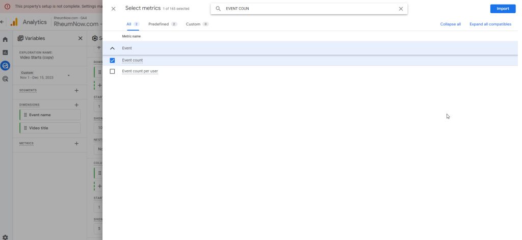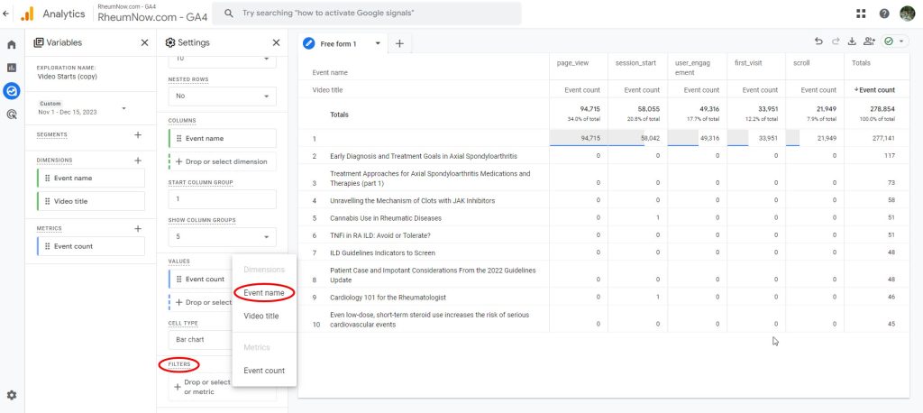 You can filter your dimensions, for example to filter your Event name to only include “video_start”.